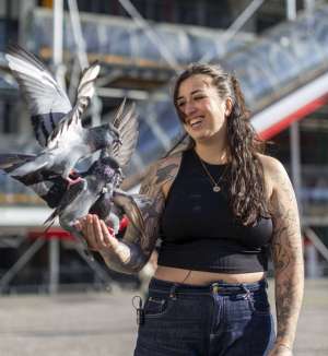 Céline aidant des pigeons (dont un huppé!) à Pompidou, Paris.